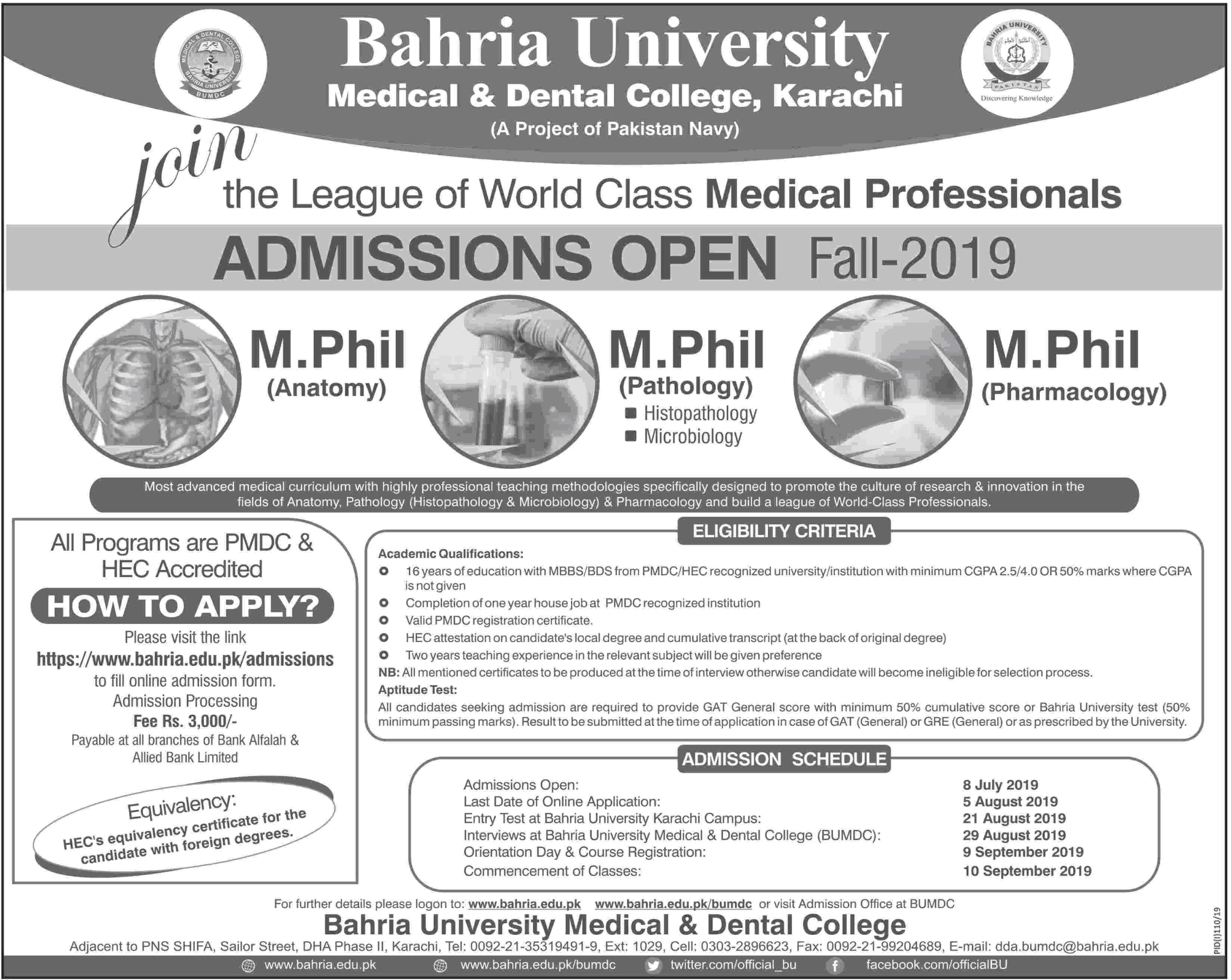 Admission Fall 2019 (Bahria University Medical & Dental College Karachi)
