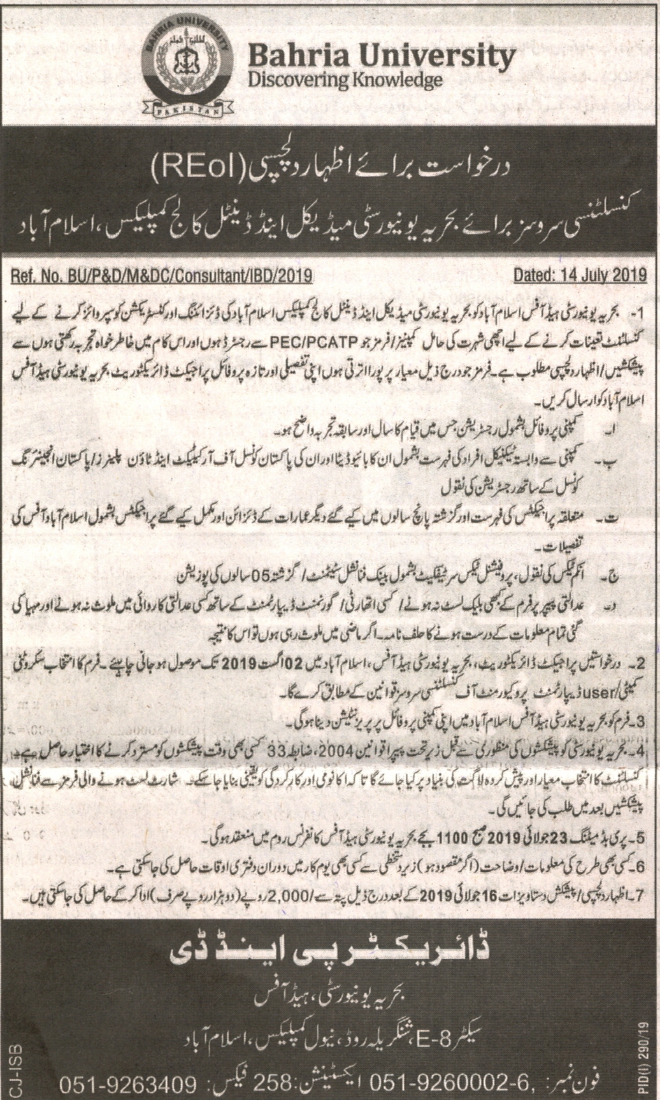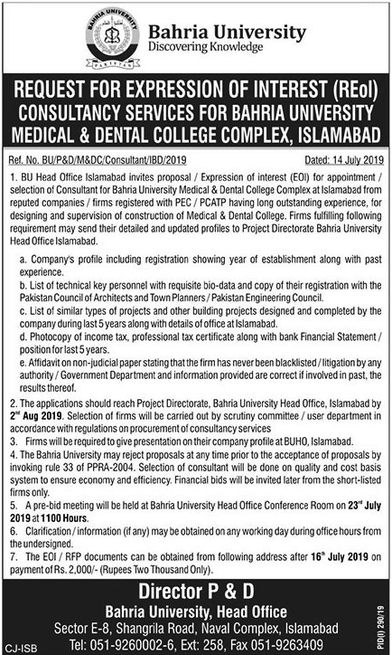 Request for expression of interest (REoI) consultancy services for Bahria University Medical & Dental College Complex, Islamabad
