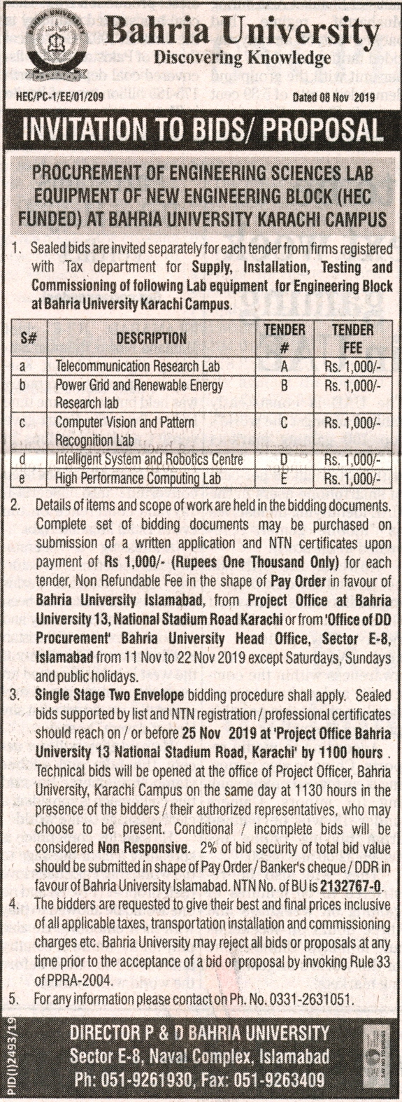 Invitation of Bids/Proposal Procurement of Engineering Sciences Lab Equipment of New Engineering Block (HEC Funded) at Bahria University Karachi Campus