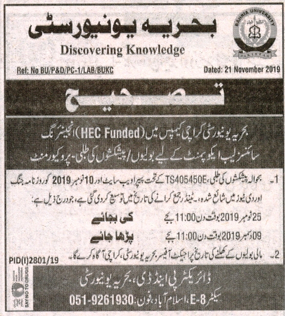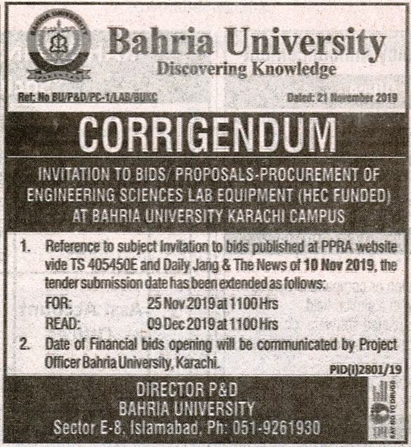 Corrigendum Invitation of Bids/Proposal Procurement of Engineering Sciences Lab Equipment of New Engineering Block (HEC Funded) at Bahria University Karachi Campus