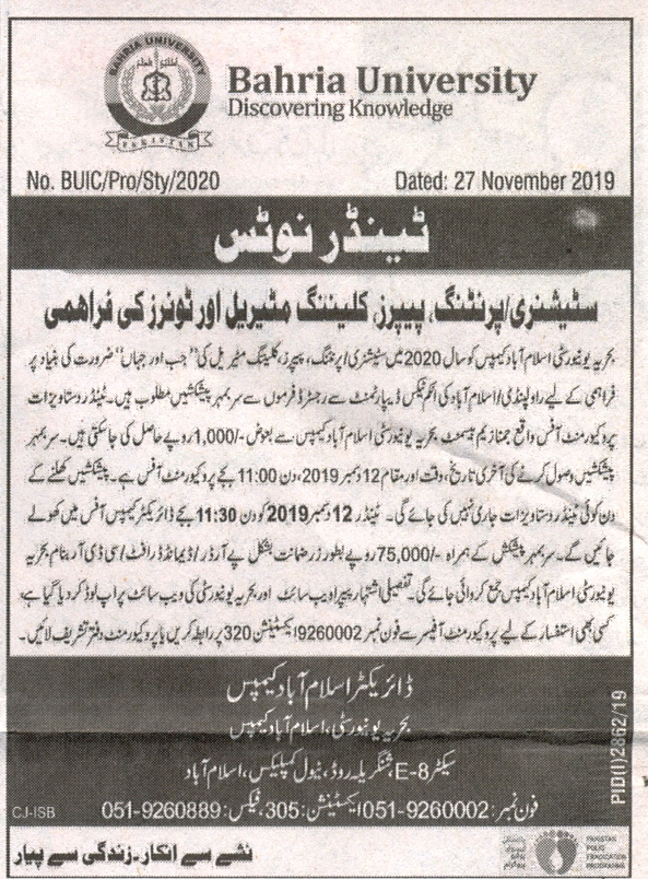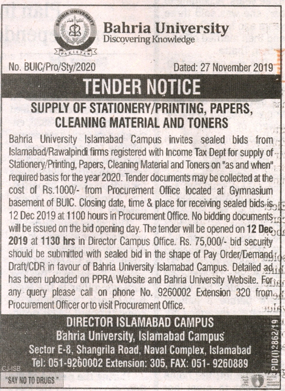 Tender Notice Supply of Stationery/Printing, Papers, Cleaning Material and Toners