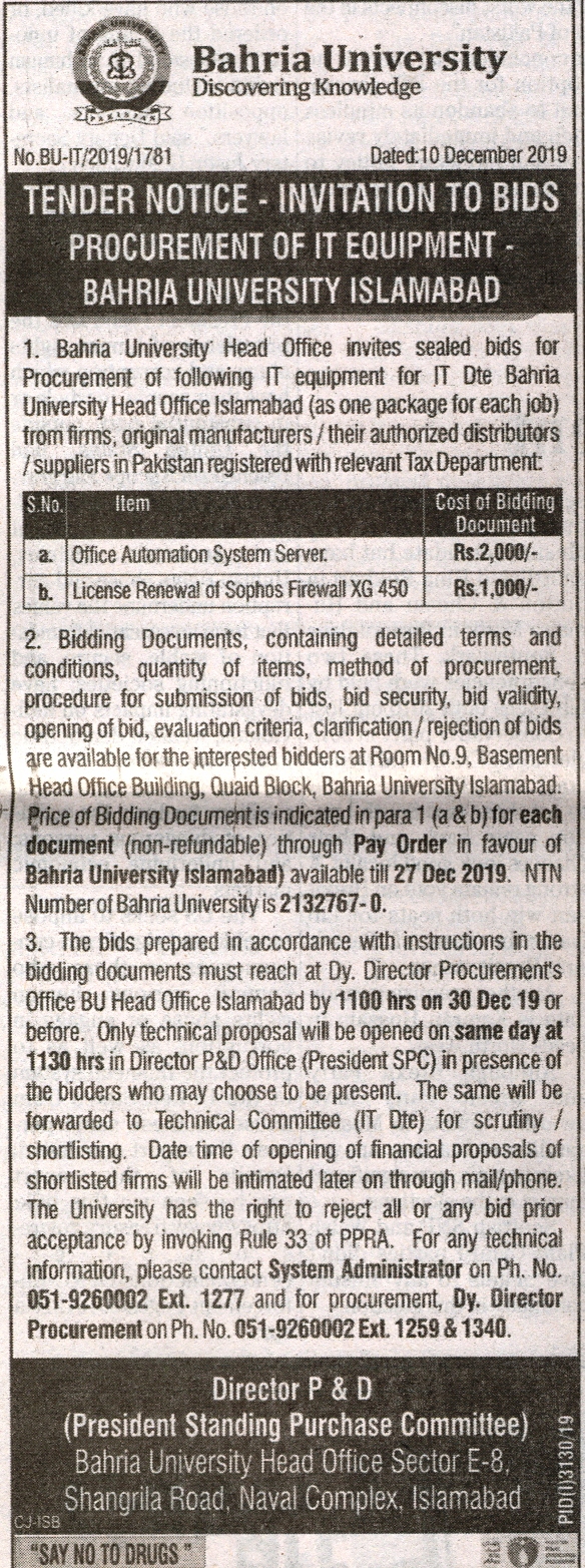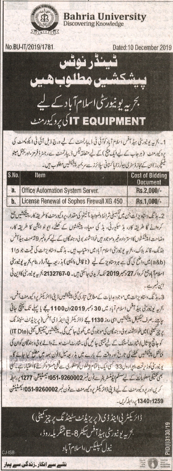 Tender Notice - Invitation to Bids Procurement of IT Equipment - Bahria University Islamabad