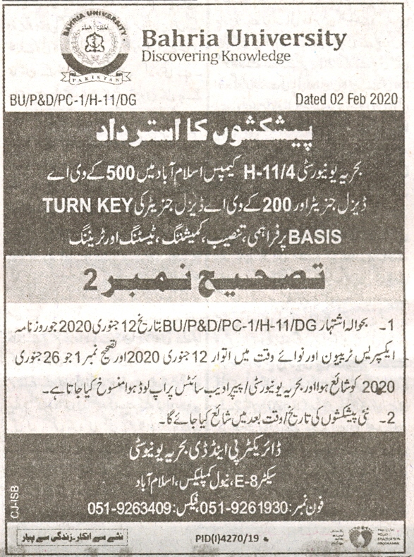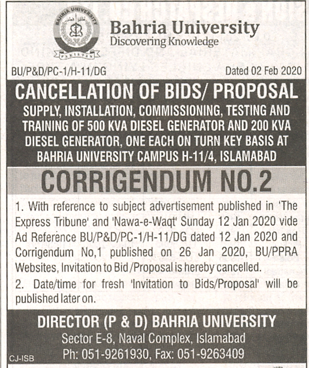 Corrigendum No. 2 Cancellation of Bids/Proposal Supply, Installation, Commissioning, Testing and Training of 500 KVA Diesel Generator and 200 KVA Diesel Generator, One Each on Turn Key Basis at Bahria University Campus H-11/4 Islamabad