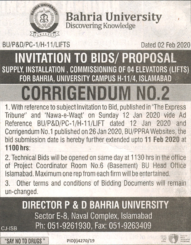 Corrigendum No. 2 Invitation of Bids/Proposal Supply, Installation, Commissioning of 04 Elevators (Lifts) for Bahria University Campus H-11/4 Islamabad