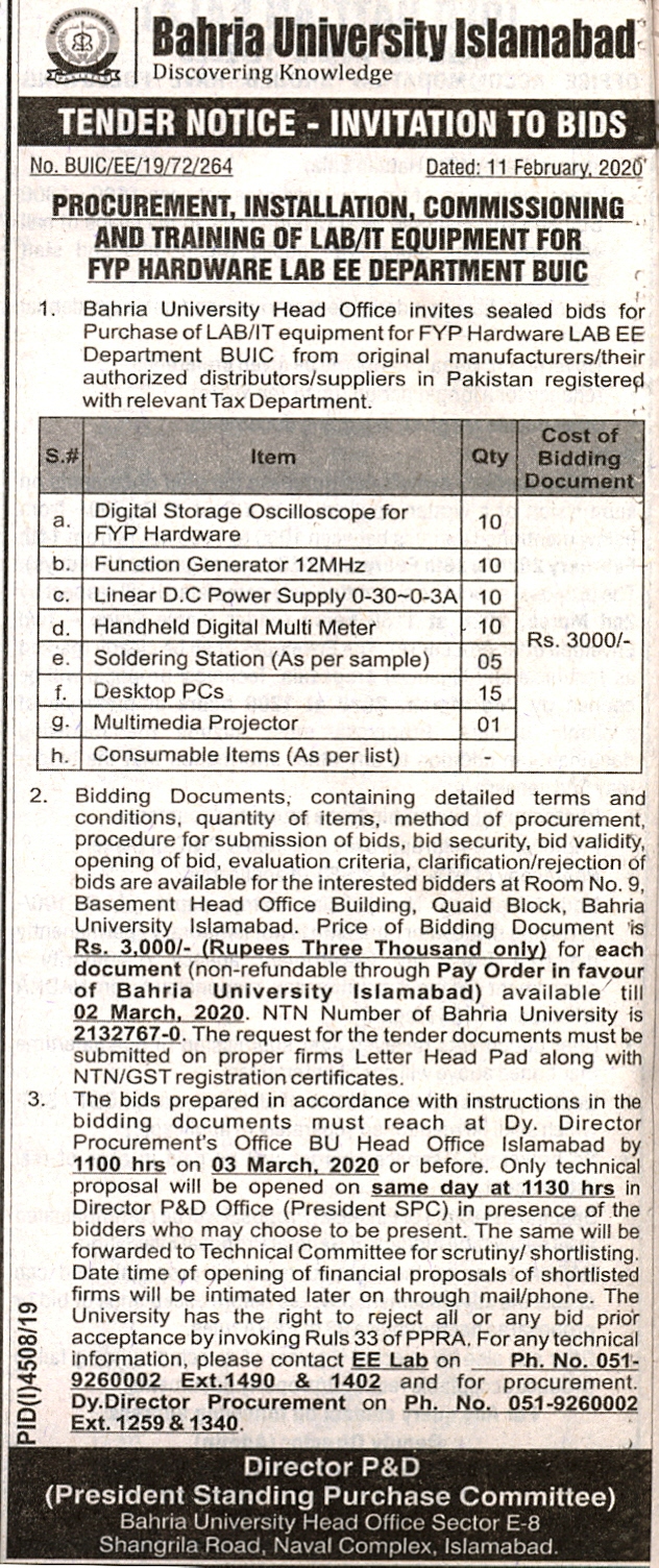 Tender Notice - Invitation to Bids "Procurement, Installation, Commissioning and Training of LAB/IT Equipment for FYP Hardware Lab EE Department BUIC