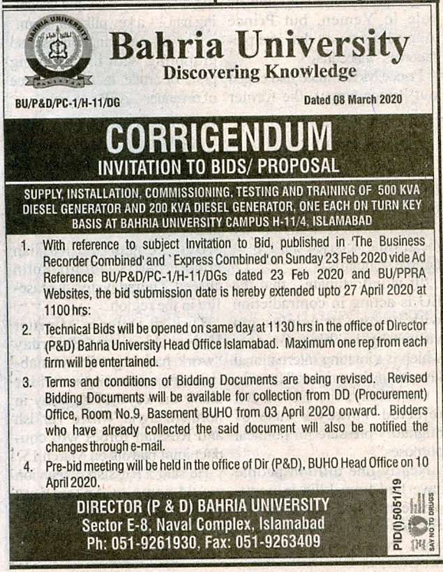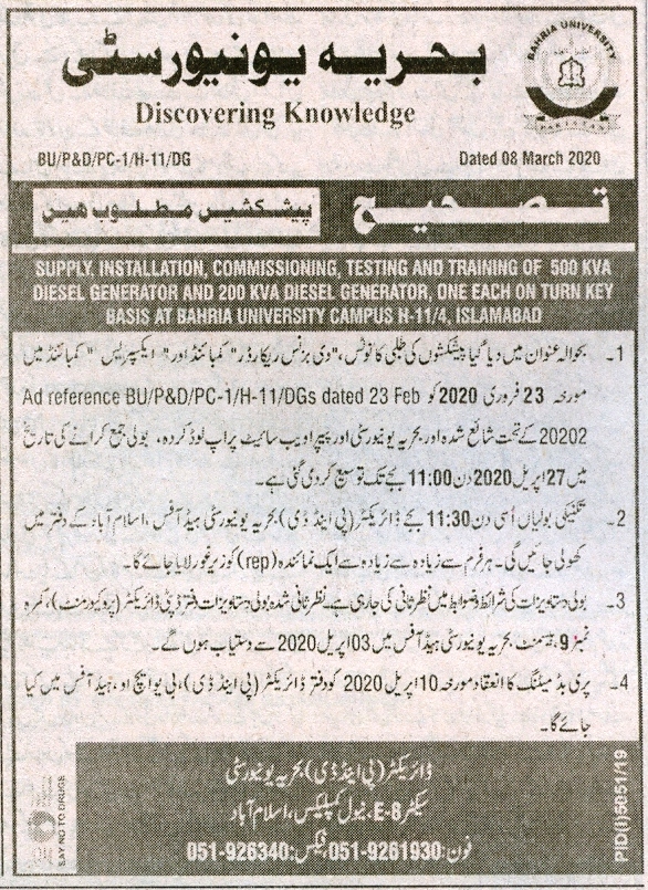 Corrigendum Invitation to Bids/Proposal Supply, Installation, Commissioning, Testing and Training of 500 KVA Diesel Generator and 200 KVA Diesel Generator, One Each on Turn Key Basis at Bahria University Campus H-11/4 Islamabad