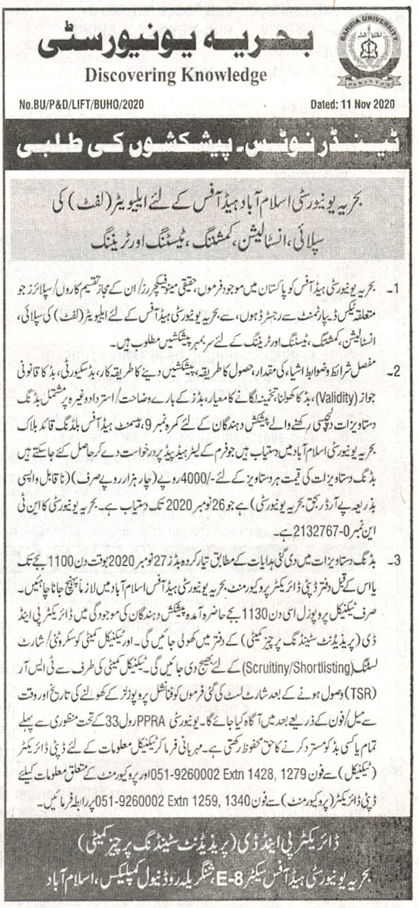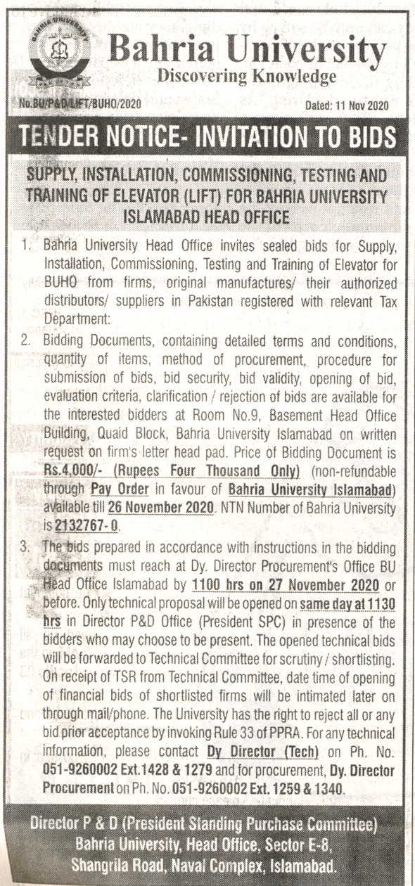 Supply, Installation, Commissioning, Testing and Training of Elevator (Lift) for Bahria University Islamabad Head Office
