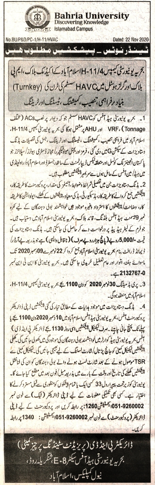 Supply, Installation, Commissioning, Testing and Training of HVAC System on Turn Key Basis for Academic Block, MP Block & Girls Hostel at BU Campus H-11/4 Islamabad
